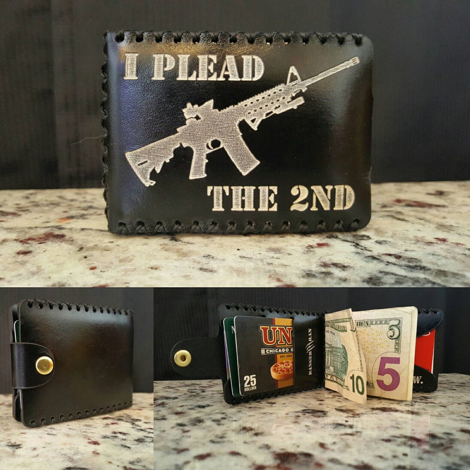 Show your support for the Second Amendment with this custom made wallet. Made from Premium English Bridle leather from Wickett and Craig. Hand sewn with imported Ritza Tigre thread. Made right here in the USA. Can be engraved with your initials for no extra charge. Just send me a message.